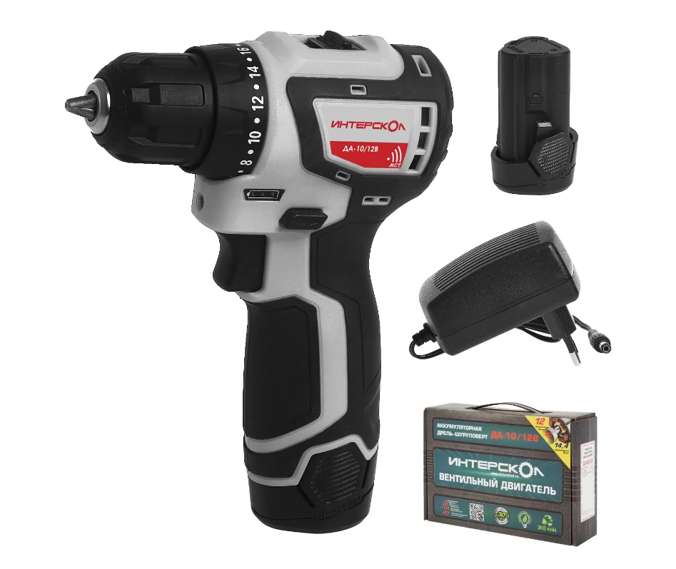 - Шуруповерт Интерскол ДА-10/12B акк. (12В,Li-ion,36Нм, 2аккум.2Ач,бесщеточный)